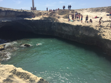 Giornata impegnativa con un elenco fitto di posti da toccare. Prima tappa, la GROTTA DELLA POESIA, una piscina naturale molto bella, uno dei tesori più preziosi e conosciuti di Puglia. Ci troviamo un delirio di persone, nonostante il mare mosso e il vento. Ci fermiamo per un tuffo e ripartiamo. Bella ma...mi aspettavo di più.