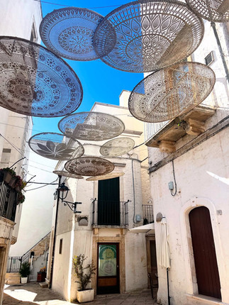 MARTINA FRANCA: La Puglia e i suoi borghi bianchi, luoghi che parlano a chi ha il tempo di ascoltare. Martina Franca è questo, ed è più di un borgo, è un dialogo continuo tra passato e presente. I vicoli imbiancati dal sole, le piazze come teatri all’aperto, l’arte che si intreccia alla vita quotidiana, i palazzi nobiliari con i loro portali scolpiti e i balconi in ferro battuto sono un trionfo di bellezza che celebra la creatività contemporanea. Ogni porta, ogni finestra sembra invitare chi passa a rallentare, ad alzare lo sguardo e a perdersi nei dettagli. Ed è nei dettagli Martina Franca sorprende: sculture e opere d’arte per strada diventano protagoniste di una narrazione visiva che la trasforma in una bellissima galleria a cielo aperto.